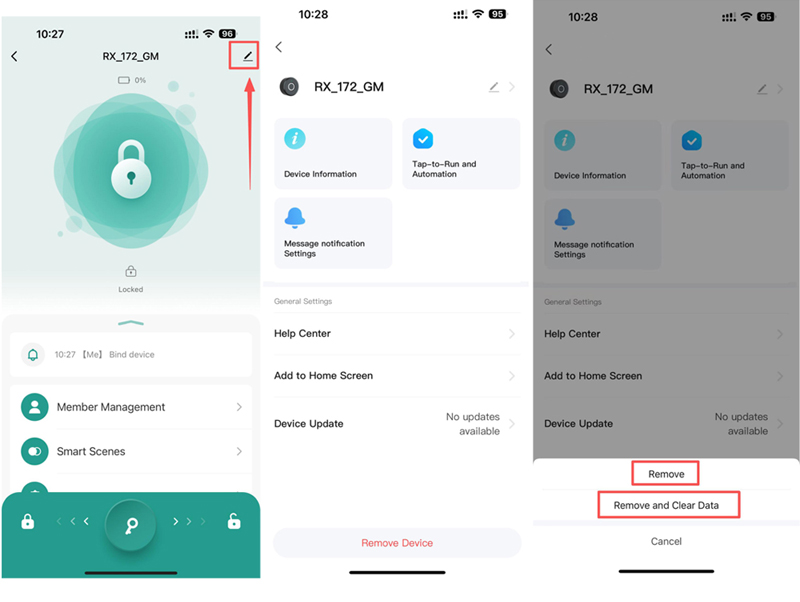 Remove: “Remove” only unbinds the app with the Device and does not restore it